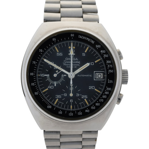 The Omega Speedmaster Mark IV features a 42mm steel case, automatic movement (caliber Cal. 9900), 50m water resistance, and 60-hour power reserve.